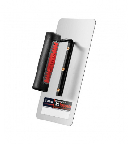 Desempenadeira de aço lisa com cantos arredondados e cabo de madeira com uma haste de fixação.